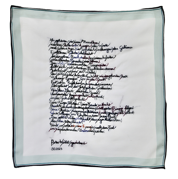 die weißen taschentücher, die oftmals auch durch einen farbrahmen oder auch eine stickerei eingefasst sind, dienen als bildgrund, auf dem die gedichte mit ihrem beinahe plastischen schriftbild wie autografen erscheinen – nur, dass die handschrift nicht auf ein schreibwerkzeug zurückgeht, sondern auf nadel und garn. handelt es sich bei den "stofftaschentüchern" um bilder oder um schriftkunst?