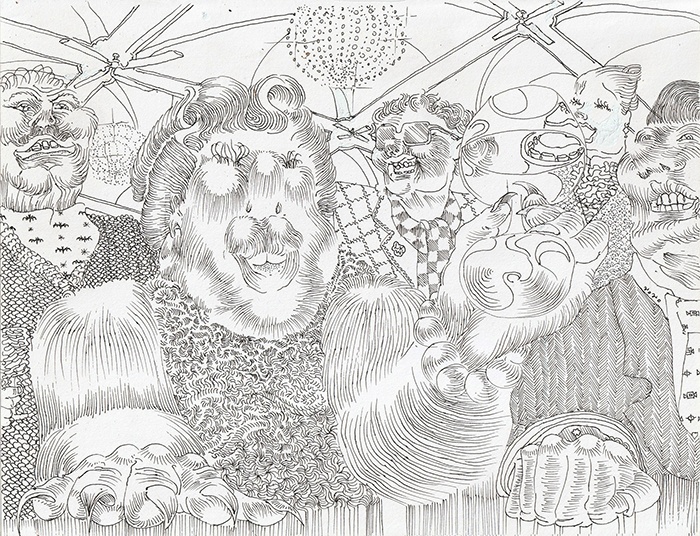 "lukas weidingers zeichnungen, ein gewirr an strichen, das sich immer wieder zu absurden bildfindungen verdichtet, scheint ohne jegliche vorbilder zu sein. improvisation oder komposition? konkrete zuschreibungen erübrigen sich im werk von weidinger, so auch in OPUS TROPUS.