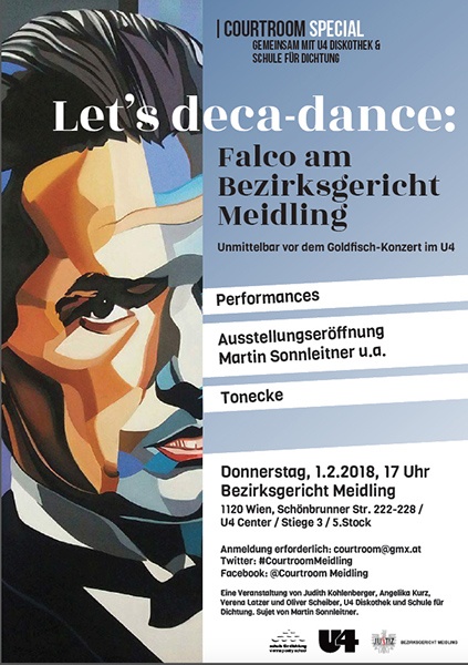 exhibition and performances on the occasion of falco's birthday, presented by courtroom meidling in association with u4 and the vienna poetry school