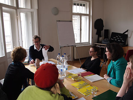 tex rubinowitz mit seinen studentinnen – noch nicht auf, aber vor dem sfd-balkon
