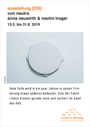 der erste schritt in der gemeinsamen arbeit [EIS] waren längere foto-texte. martin troger hat einen textberg verfasst. anna neuwirth hat fotos dazu gemacht und im nächsten schritt aus den foto-texten auszüge ausgewählt, die im zusammenhang mit dem foto die form ergeben, die neutro in der schule für dichtung ausstellen wird.