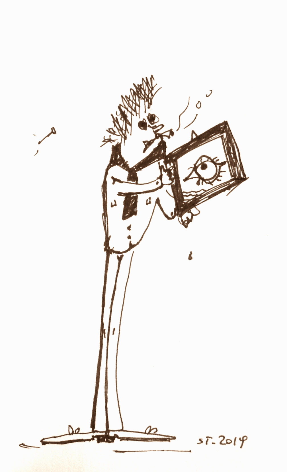 ein rauchender galerist hängt ein auge an den nagel? oder gibt es noch eine andere bedeutung? vielleicht könnte man eine sprechblase hinzufügen.