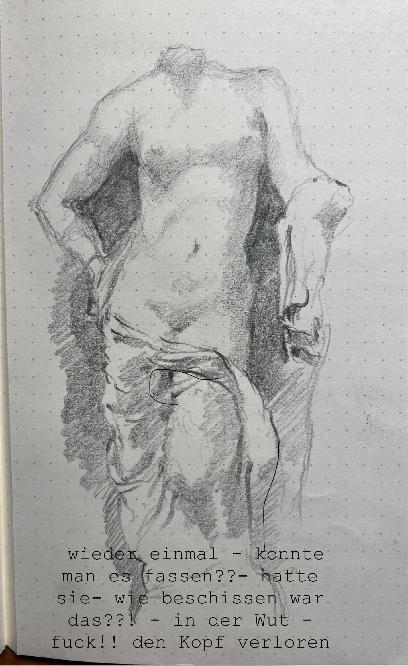 Noch ein zeichnerischer Beitrag, wie schön! Ein tolles Beispiel dafür, dass Medienkombinationen die Möglichkeit bieten, erzählerische Brüche zu erzeugen. In vorliegendem Beispiel entsteht durch den beigefügten Text ein Comic Relief-Moment. Dieser wiederum kann nur entstehen, weil die Darstellung der Statue das kulturelle Gedächtnis an sich und damit verbundene normative Praktiken über Kunst zu sprechen abruft. Mit dieser Normativität wird hier gespielt, well done.